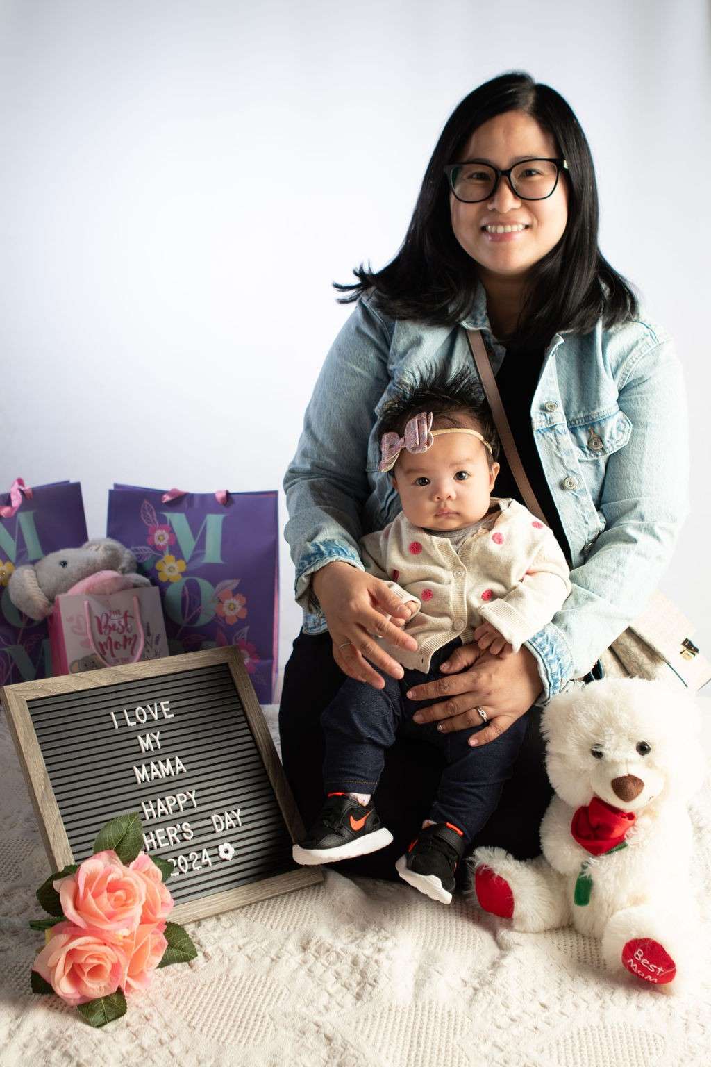 Our Newmarket studio offers a cozy, private, and professional space with themed setups perfect for Mother’s Day. Styled with soft pastels, elegant florals, and flattering lighting, it’s the perfect environment for a comfortable and heartfelt portrait session.